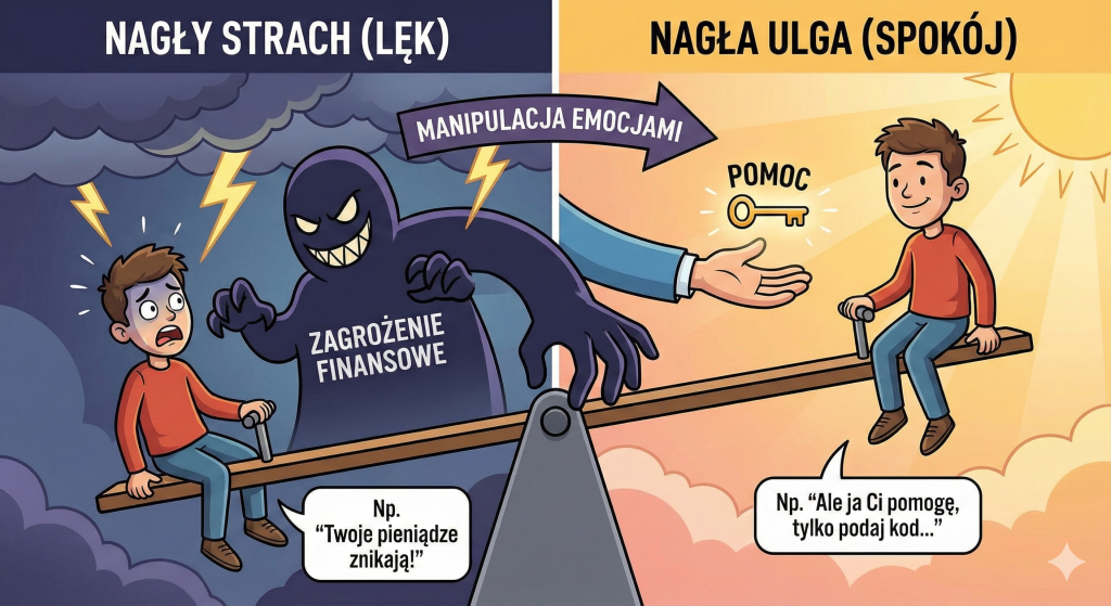 Według badań prof. Dolińskiego, jedną z najskuteczniejszych technik manipulacji jest tzw. „huśtawka emocjonalna”. Polega ona na gwałtownym wywołaniu u nas lęku (np. „Twoje pieniądze znikają!”), a następnie nagłym przyniesieniu ulgi (np. „Ale ja Ci pomogę, tylko podaj mi kod”).